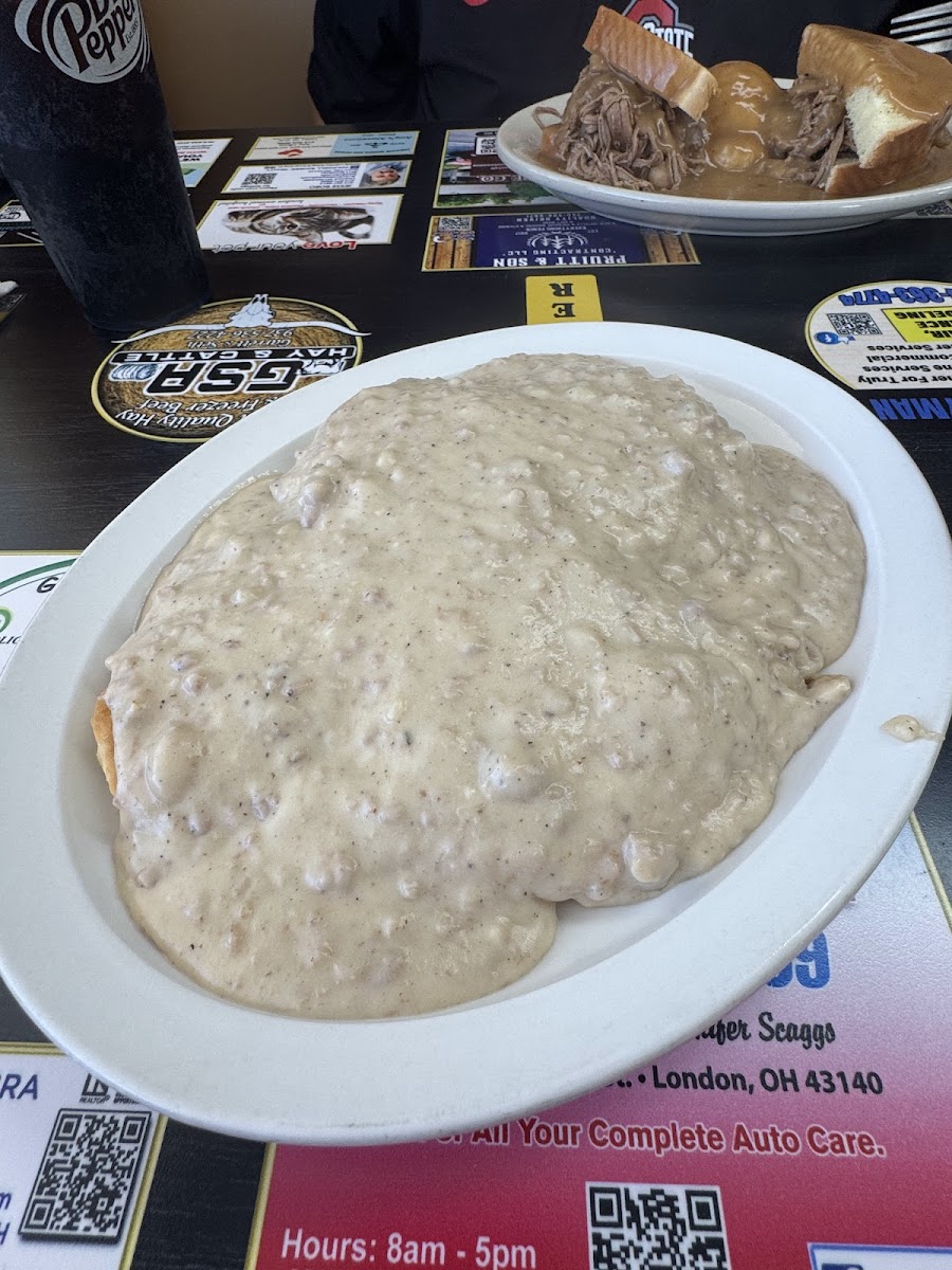 We stopped in on our way from Columbus to Cincinnati. We ordered the biscuit and gravy along with the split roast beef. The sausage gravy and biscuits were just like grandma makes and the roast beef was enormous. My husband loved the roast beef and mash potatoes. He said they were delicious. Service was good and they are very friendly. Definitely a hidden gem if you like home cooking!