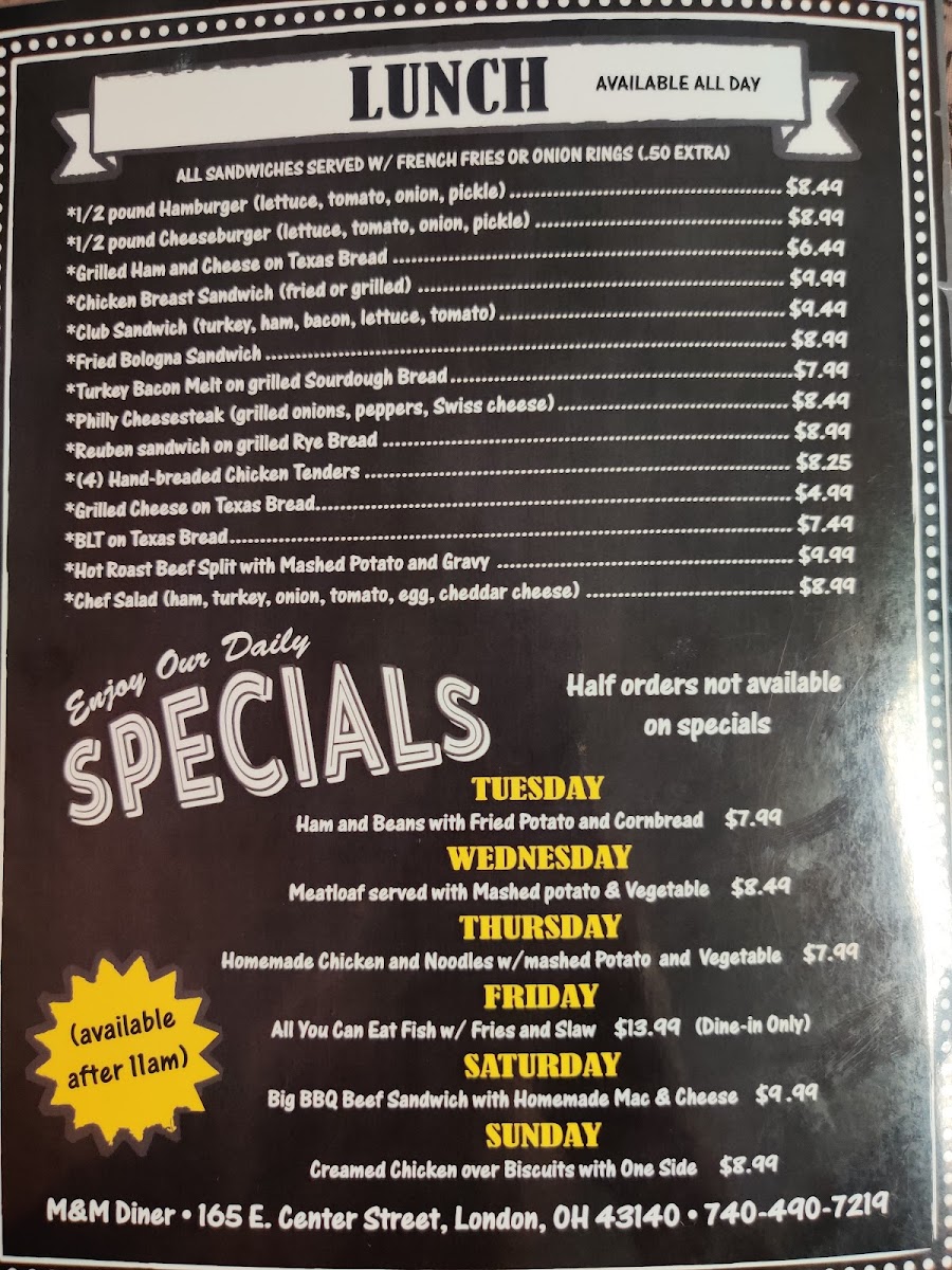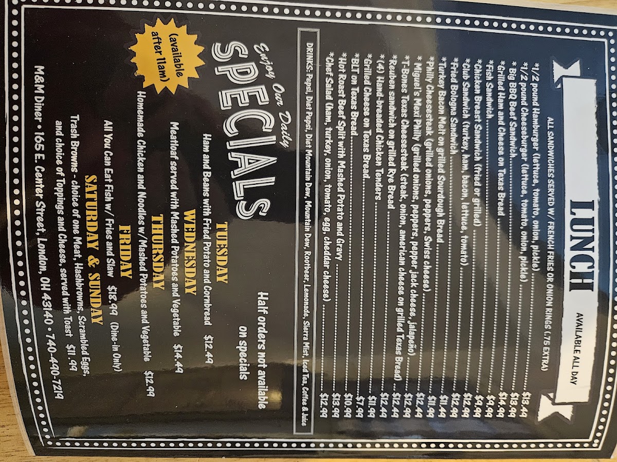 Welcome to M&M Diner, a cozy spot nestled in London, OH, where comfort food meets hearty portions. The diner’s menu is a delightful mix of choices, satisfying breakfast cravings and dinnertime hunger alike. Start your day with classics like the French toast, or for something savory, try the impressive biscuits and gravy topped with eggs. Lunchtime favorites include the turkey melt and Reuben, renowned for their generous servings and robust flavors.